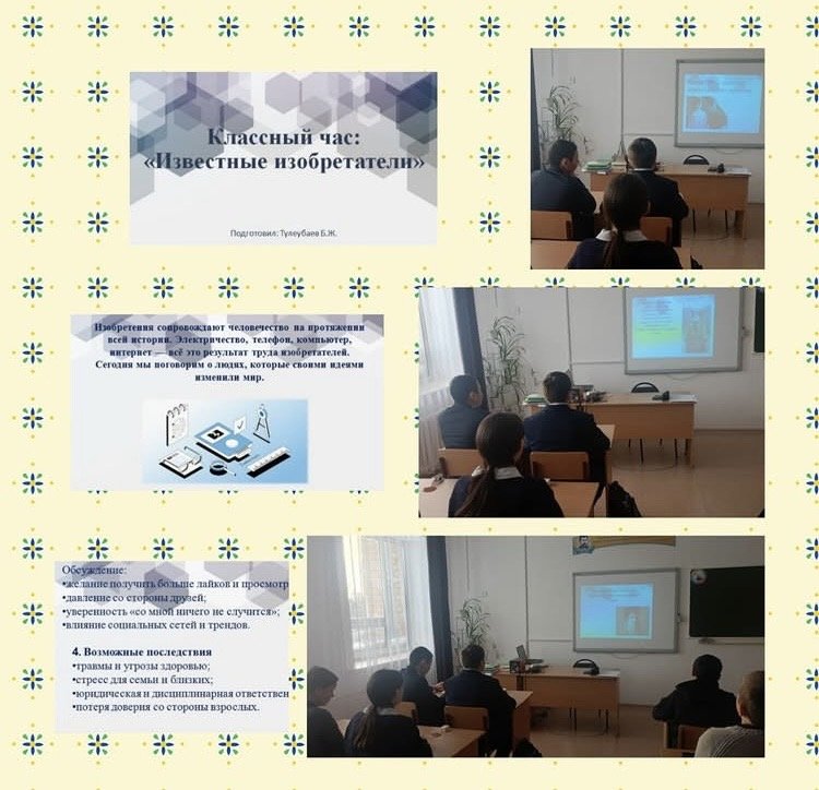 8 «Б» сыныбында «Белгілі өнертапқыштар» тақырыбында сынып сағаты өткізілді. Мақсаты: оқушылардың белгілі өнертапқыштар және олардың жаңалықтары туралы білімдерін кеңейту; өнертабыстардың ғылым мен қоғам дамуы үшін маңызын көрсету; ғылымға, техникаға және...